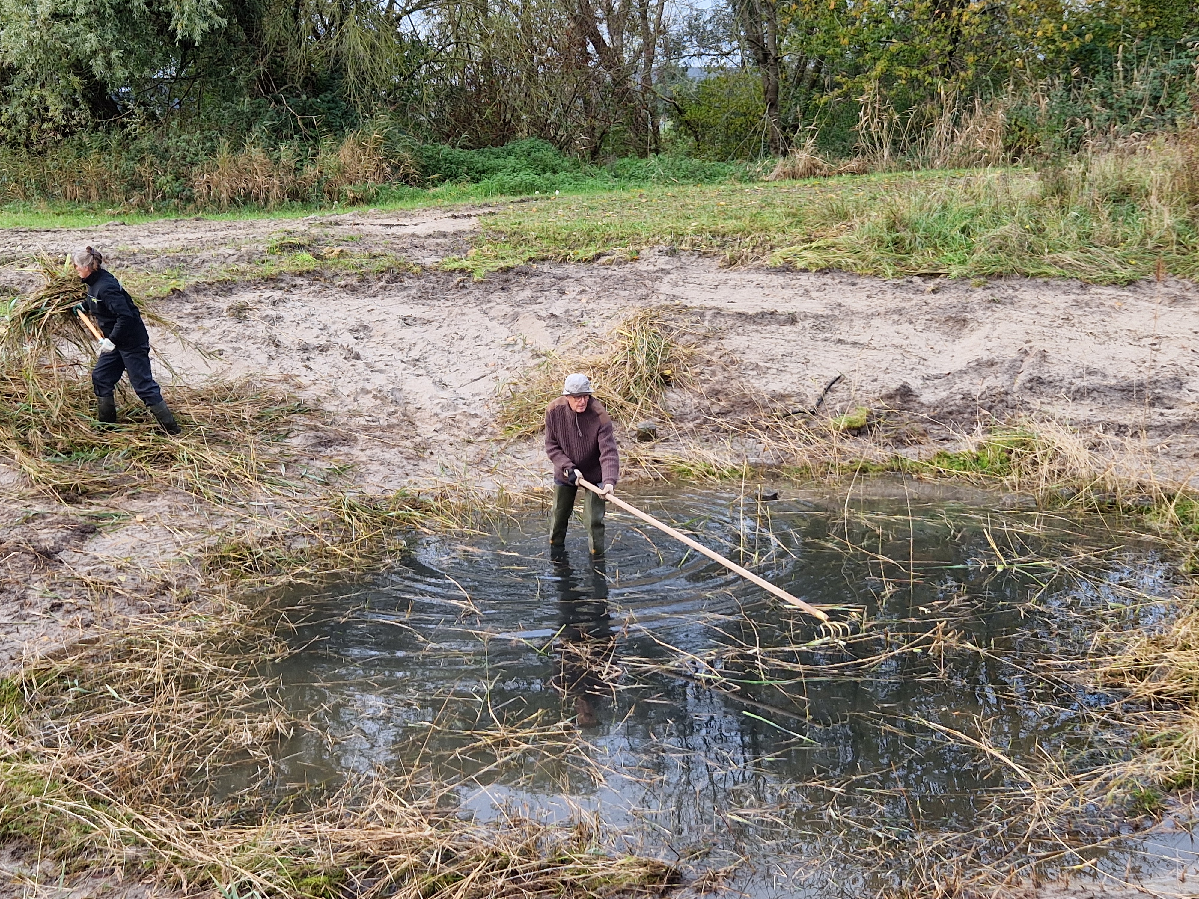 Het werk wisselt per seizoen. In april bestrijden we uitheemse planten. In mei en juli maaien we de oevers met de zeis en voeren we het maaisel af. Van dat maaisel maken we broeihopen, speciale composthopen waar de ringslang haar eieren in legt. Eind september schonen we de poelen en in november controleren we de broeihopen. Volgend jaar kunnen vrijwilligers ook meehelpen met het tellen en waarnemen van de rugstreeppad.