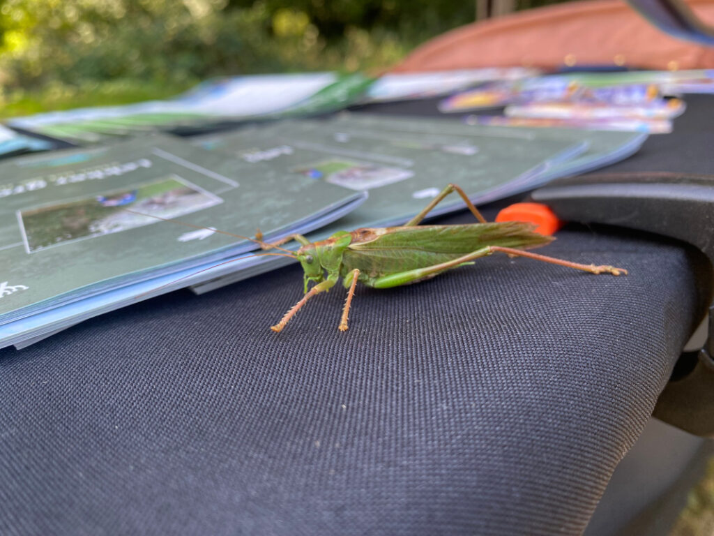 Naast de zeisdemonstratie werd er ook gehaard; er waren twee zeisbladen die dringend scherp gemaakt moesten worden, dus algauw klonk het getik van de hamer op de slagdengels over de markt. De vele kinderen die op het herfstfeest rondliepen waren ook erg geïnteresseerd in het haarapparaat en de verschillende insecten die rond de tafel sprongen, zoals deze mooie groene sabelsprinkhaan.